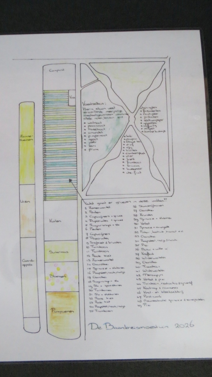 Vaak is het in de zomer zo druk qua camping dat we eigenlijk geen tijd hebben voor de tuin en er zijn een aantal jaren geweest dat we blij waren dat er een tuinder was die de tuin voor ons invulde. In 2016 en 2017 was dat Annette van Bracht en in 2020 was Stefan Hanstede hier. Maar in het jaar 2021 en 2022 hebben we het weer zelf ter hand genomen, fijn, maar wel heel veel werk naast al het werk dat we al hebben.Daarna heeft Freek te Brinke, oud-eigenaar van natuurvoedingswinkel de Tommelbos in Dieren in de jaren '23, '24 en '25 de mooie taak ter hand heeft genomen om van de Baankreis- groentetuin een mooi en voedzaam geheel te maken! Maar nu gaan we het vanaf 2026 het weer zelf doen! Het plan ligt klaar en op papier ziet dat er zo uit: